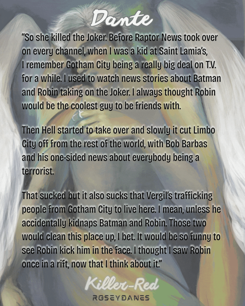 Putting Dante and Jason together, having them meet, felt right and interesting to me. And I knew I wanted to make this story a little heavier since I would be revisiting two of my own characters, who were sort of tragic and moody. So I created Killer-Red himself. While he is a combination of Jason Todd’s alters, supernaturally charged by Dante’s angelic half, he is also mine in a way. Therefore, I felt more comfortable going a little darker, a little more intense, and a little sadder with him.